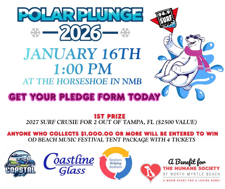 The Midwinter Surf Polar Plunge to benefit the Humane Society of North Myrtle Beach is today at the beach near OD Horseshoe. Check in at the Tiki Bar at noon if you are plunging.