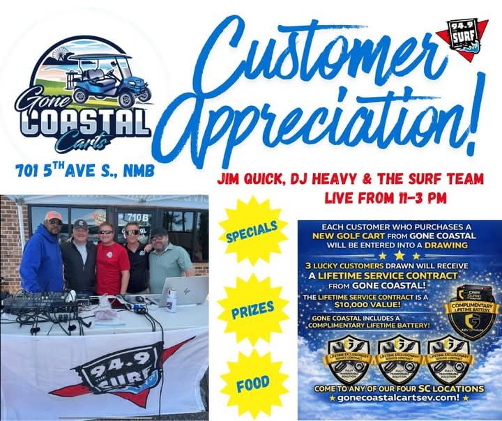 It is Saturday again. Jay Kinlaw will be on the surf at 10am for the Surf Countdown. The Surf Crew will be at Gone Coastal Carts North today for a LIVE remote customer appreciation party.